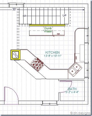 Two problems there, first, with a raised glass breakfast bar, the room for pop up vent was limited. And secondly, where do you vent to? After some discussion we decided to modify the floor plan somewhat to accommodate an outdoor venting of the stove. Here is the new layout: